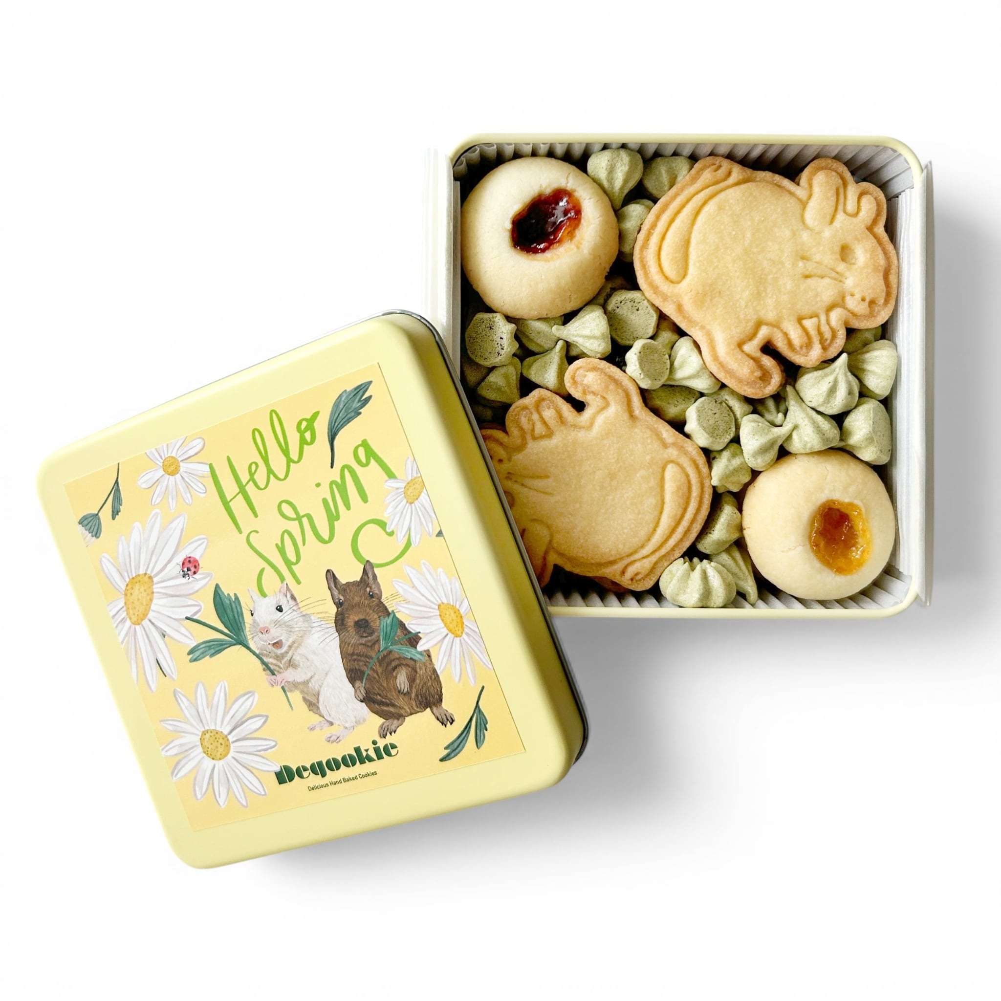 デグーの形をしたバタークッキー、お花をイメージしたジャムクッキー2種、大人の抹茶メレンゲが詰まった春を感じる詰め合わせです。